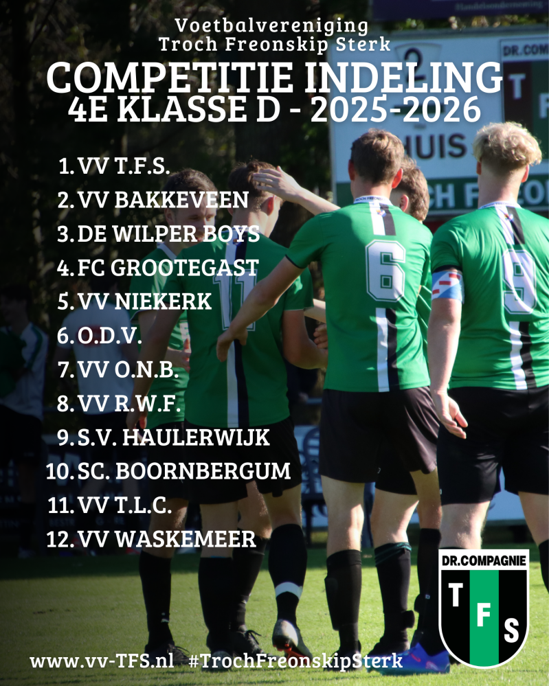 De nieuwe competitie-indeling voor ons eerste elftal is bekend! Helaas geen derby’s tegen Rottevalle en ONT, en daarnaast is de 4e klasse van 14 naar 12 ploegen gegaan.