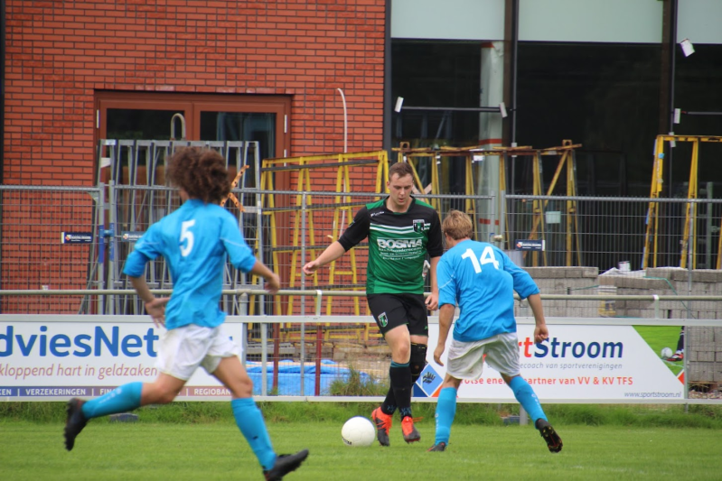 Onder leiding van scheidsrechter Adema werd er om 14:30 afgetrapt voor de wedstrijd. Al gelijk werd duidelijk wat de intenties waren van de gasten. Gretig druk zetten om vroeg op voorsprong te komen. TFS bood veel weerstand en mede door keeper Geert Kruize wist de uitploeg niet zomaar te scoren. De Kompenijsters probeerden te counteren, maar de aanvallen werden 10 van de 10 keer afgevlagd, dus werd het vooral tegen houden. In de 30e minuut viel dan toch het eerste doelpunt. Het is Mitchell Schievels van Waskemeer die vanuit de rug van de verdediger door wist te lopen op de bal en gemakkelijk binnen kon schieten. Zoals eigenlijk de gehele wedstrijd bleven de mouwen opgestroopt bij de Kompenijsters en zo ook na de 0-1. De enige manier dat Waskemeer wederom in de 1e helft wist te scoren was door een gegeven penalty die spits Schievels koeltjes binnen schoof. (0-2)