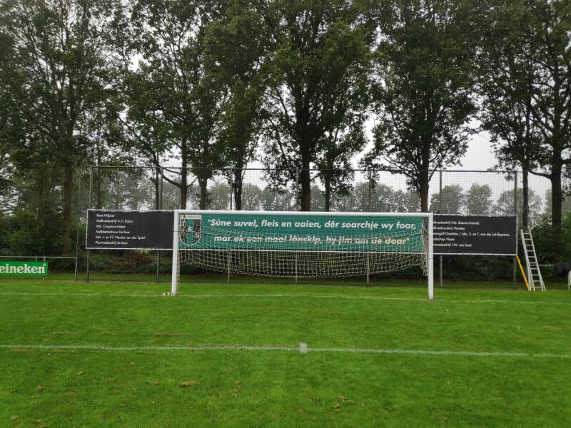 Tijdens de ontwerpfase hadden wij de boeren gevraagd om mee te denken over een Fryske spreuk en dat leverde twee hele mooie spreuken op: “It is de Boer al lyke folle, ast no mij de foet sjist as mij de holle” en “Sûne suvel, fleis en aaien, dêr soarchje wy foar, mar ek in moai lânskip by jim om de doar”. De keuze viel bij de boeren al snel op de door Jurjen Visser bedachte spreuk “sûne suvel”. Met behulp van een tweetal boeren konden wij het fantastische 18 meter lange spandoek ophangen en het resultaat is geweldig. De positieve reclame voor de boeren en de firmanamen op het spandoek hebben op deze manier een schitterend plekje gekregen langs het hoofdveld.
